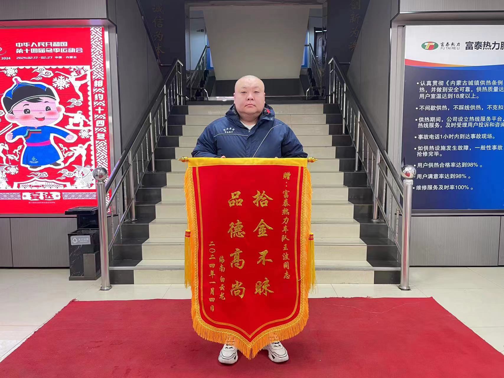 1月9日,海南省來(lái)呼辦事的白云龍先生將一面寫(xiě)有“拾金不昧 品德高尚”的錦旗送到了富泰熱力公司,對(duì)公司綜合管理部員工王波拾金不昧的暖心行為表示真摯的感謝。