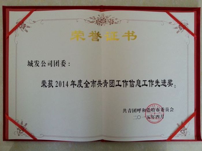 2015年4月3日,在共青團(tuán)呼和浩特市十六屆二次全委(擴(kuò)大)會(huì)暨少工委五屆五次全委(擴(kuò)大)會(huì)議上,城發(fā)公司團(tuán)委榮獲“2014年度全市共青團(tuán)工作信息工作先進(jìn)獎(jiǎng)”。