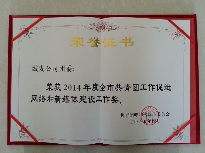 201543,在共青團(tuán)呼和浩特市十六屆二次全委(擴(kuò)大)會(huì)暨少工委五屆五次全委(擴(kuò)大)會(huì)議上,城發(fā)公司團(tuán)委榮獲“2014年度全市共青團(tuán)工作促進(jìn)網(wǎng)絡(luò)和新媒體建設(shè)工作獎(jiǎng)”。