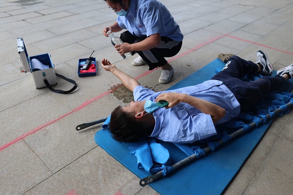 滅火組出動、疏散與警戒組出動、后勤通訊與救援組出動。參演人員一聲聲清晰宏亮的指令與報告從電話和對講機傳來,各應(yīng)急小組分頭行動完成工作之后,開始向指定位置集合,分別向現(xiàn)場指揮官趙建輝匯報工作完成情況。