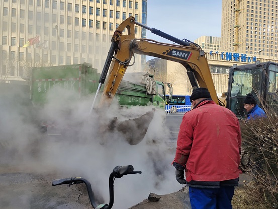 在鄂爾多斯東街龍谷華庭和銀聯(lián)大廈樓前臨街道路欄桿旁,緊靠人行道的一臺挖掘機正發(fā)出轟鳴聲,地溝內(nèi)不斷冒出騰騰熱氣這是1月2日下午15:00,在該地段搶修一次管網(wǎng)的畫面。當日,熱心市民發(fā)現(xiàn)該處路段人行道有熱水冒出。城發(fā)橋靠分公司第六運營所工作人員接到熱線通知后,立即趕往現(xiàn)場。經(jīng)測水溫為74℃,確定為一次網(wǎng)漏水。所長耿焱立即逐級上報,并安排所部人員對漏點進行現(xiàn)場安全防護,同時對漏點情況進行觀察。