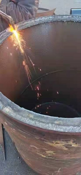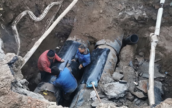 在場人員研究制定了搶修方案,決定不更換管道,而采用"包裹式"的方式進行修復(fù)--在原DN700的老舊管道上包裹DN800的管套封堵漏點,將DN800的管道切割成兩部分,分別安裝,與水泥管道接近的部分打磨成壁度在4公分以內(nèi)的管壁,焊接后進行管道碰口。當時,室外溫度已降至-15℃,地溝內(nèi)溫度高,地面溫度低,施工難度大。為保證快速、高效、安全完成新管套接,搶修人員只能手提工具沿著管道貓著腰爬到連接處,窩在管道下方,在管套與管網(wǎng)連接處焊接。