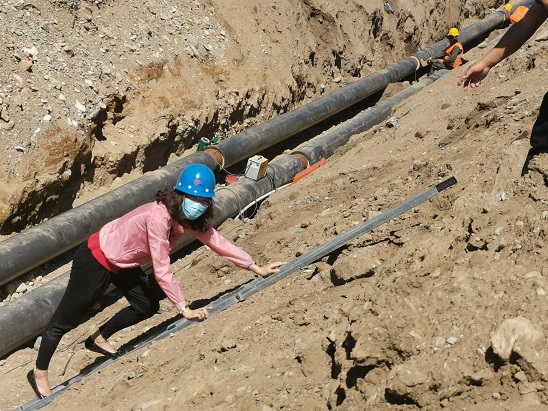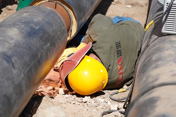 筆者帶好安全帽,也順著工人們下溝的唯一路徑----一個(gè)近乎垂直立在溝邊梯子下到溝里,每走一步,周圍的土就在"簌簌"的往下掉,筆者的心也跟著這些土渣心驚膽戰(zhàn)。來到管道溝里,兩根粗粗的管子并排向遠(yuǎn)方延伸去。管溝雖然深,但是并不寬,作業(yè)空間不大。