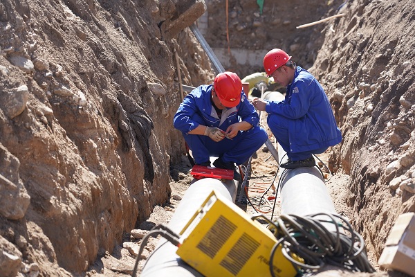 一個(gè)工人師傅,側(cè)身躺在兩個(gè)管道中間的狹小夾縫中,對管道進(jìn)行焊接。施工單位天津管道公司的段步雨向筆者介紹,"現(xiàn)在這個(gè)師傅做的是第二道工序,叫電焊造面。你看到這么長的管子,都是一截一截焊接起來的,焊接要兩道工序,第一道是氬弧焊打底,就是在電弧焊的周圍通上保護(hù)氣體----氬氣,使焊材不能和空氣中的氧氣接觸,從而防止了焊材的氧化,所以第一遍要用氬弧焊,就是為了焊口不生銹,確保它的使用年限。氬弧焊完成后,為了管道外壁齊平,焊口更牢靠,再進(jìn)行第二遍電焊造面。"
