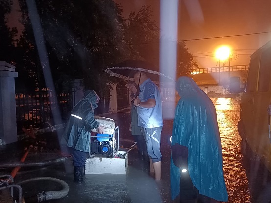 橋靠分公司組織員工們先將防汛沙袋置于地勢(shì)較低的單元門口,將水泵置于地勢(shì)最低處做好了防汛排水的準(zhǔn)備工作。為了確保人民群眾的生命財(cái)產(chǎn)安全,在做好前期準(zhǔn)備工作后,大家便守在現(xiàn)場,密切關(guān)注天氣情況,實(shí)時(shí)監(jiān)測(cè)雨情汛情,雖然白天的天空還能看到藍(lán)天白云,但他們堅(jiān)守崗位絲毫不敢松懈,只是買了盒飯靠在車旁簡單的解決了溫飽。13日夜間22時(shí),隨著雨量的加大及降雨的持續(xù),小區(qū)內(nèi)地勢(shì)低洼處排水量開始小于降水量,積水深度開始上漲。此時(shí)天空就像是開啟了“水簾洞”模式,穿著雨衣依舊全身濕透的防汛職工們冒著雨淌著水一遍遍的查看,按照防汛作業(yè)預(yù)案開展工作,他們始終堅(jiān)守一線在暴雨中逆行,全力以赴守護(hù)轄區(qū)群眾安危。