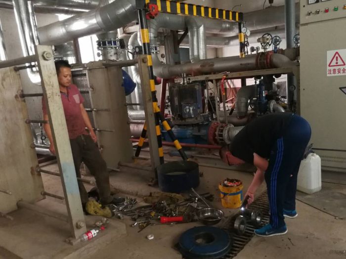 第一站為運營二所儲運熱力站,站內(nèi)一派忙碌的檢修景象,檢修人員正在拆解75KW循環(huán)泵。據(jù)運營二所檢修助理尚帥介紹,此臺循環(huán)泵于2005年投入使用,運行期間,可供儲運小區(qū)、會計學校、煤炭大廈、以及中華家園一期等居民用熱。在拆解過程中發(fā)現(xiàn)循環(huán)泵電機線包有燒焦處并且發(fā)黑,電機端蓋也磨損嚴重。副經(jīng)理劉強仔細查看,囑咐二所人員針對老、舊設(shè)備工況應(yīng)及時采購更換以保證冬季采暖期熱用戶的用熱保障。隨后,前往運營三所恒大G區(qū)熱力站進行安全檢查,站內(nèi)檢修人員正在清洗除污器。