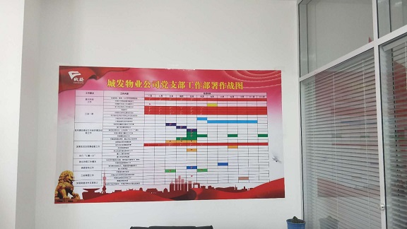 6月1日,城發(fā)物業(yè)公司黨支部辦公室、黨群工作處的兩張黨建工作部署作戰(zhàn)圖展板,吸引了全體干部職工的注意力。這兩張展板不僅詳細(xì)地安排部署了今年黨建的各項(xiàng)重點(diǎn)工作和日常工作,同時(shí)按照時(shí)間節(jié)點(diǎn),細(xì)化操作舉措,掛圖作戰(zhàn),序時(shí)推進(jìn),精準(zhǔn)發(fā)力,穩(wěn)扎穩(wěn)打,逐步推進(jìn)基層黨組織建設(shè)工作水平。