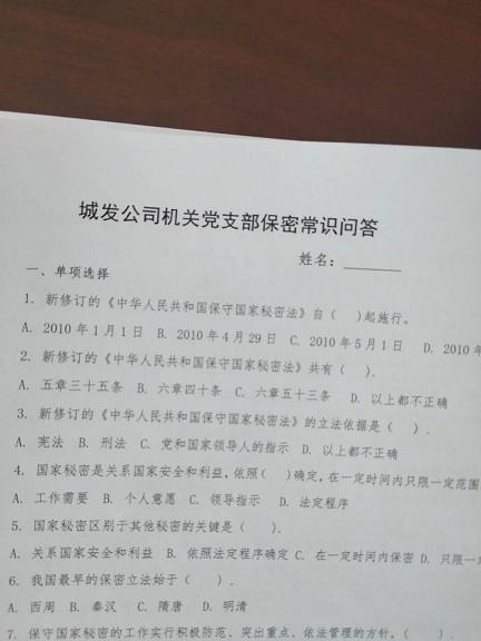還集中進行了保密教育。為進一步推動保密和密碼工作現(xiàn)行方針、政策、法律法規(guī)學(xué)習(xí)宣傳活動,增強廣大黨員干部群眾的保密意識、保密法制觀念和強化密碼法的學(xué)習(xí)宣傳,黨支部通過發(fā)放解答“城發(fā)公司機關(guān)黨支部保密常識問答”100題的考卷,進行了“忠誠干凈、踐行使命,法在心中、法在行中”為主題的《保密法》《密碼法》宣傳教育。